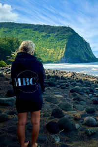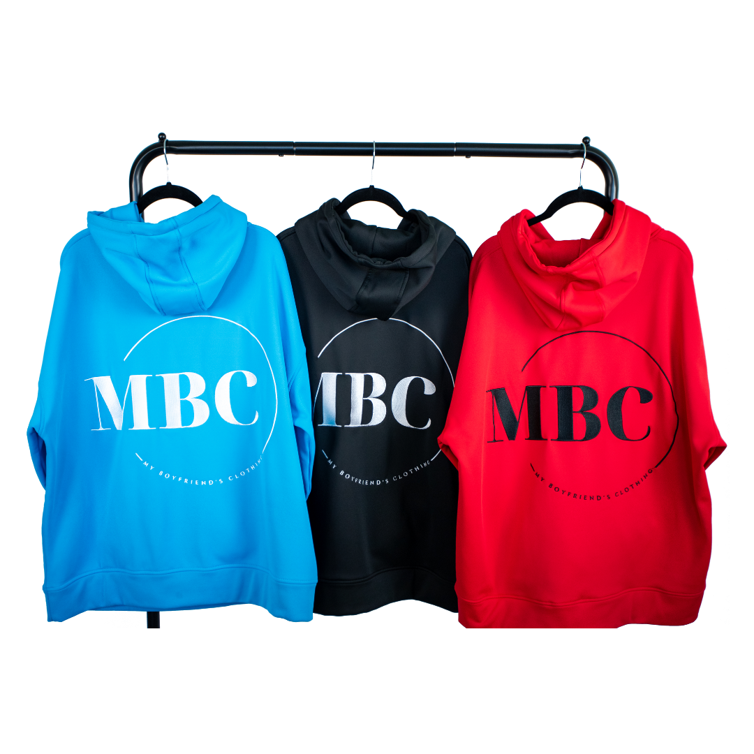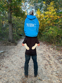 The back of the His Favorite Blue Hoodie from My Boyfriend’s Clothing, featuring an embroidered "MBC" logo in crisp white, encircled by a minimalist design with the brand name subtly arched below. The vibrant blue fabric and oversized fit bring a bold, cozy look that feels like it’s just waiting to be stolen from him.