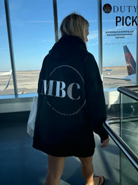 The back of the Midnight Snuggle Hoodie fromMy Boyfriend's Clothing, featuring an embroidered "MBC" logo in crisp white thread, framed by a minimalist circular design with the brand name subtly curved below. The embroidery adds a premium, textured look to the sleek black fabric, capturing that cozy, oversized fit that feels like it was made to be stolen from his closet.