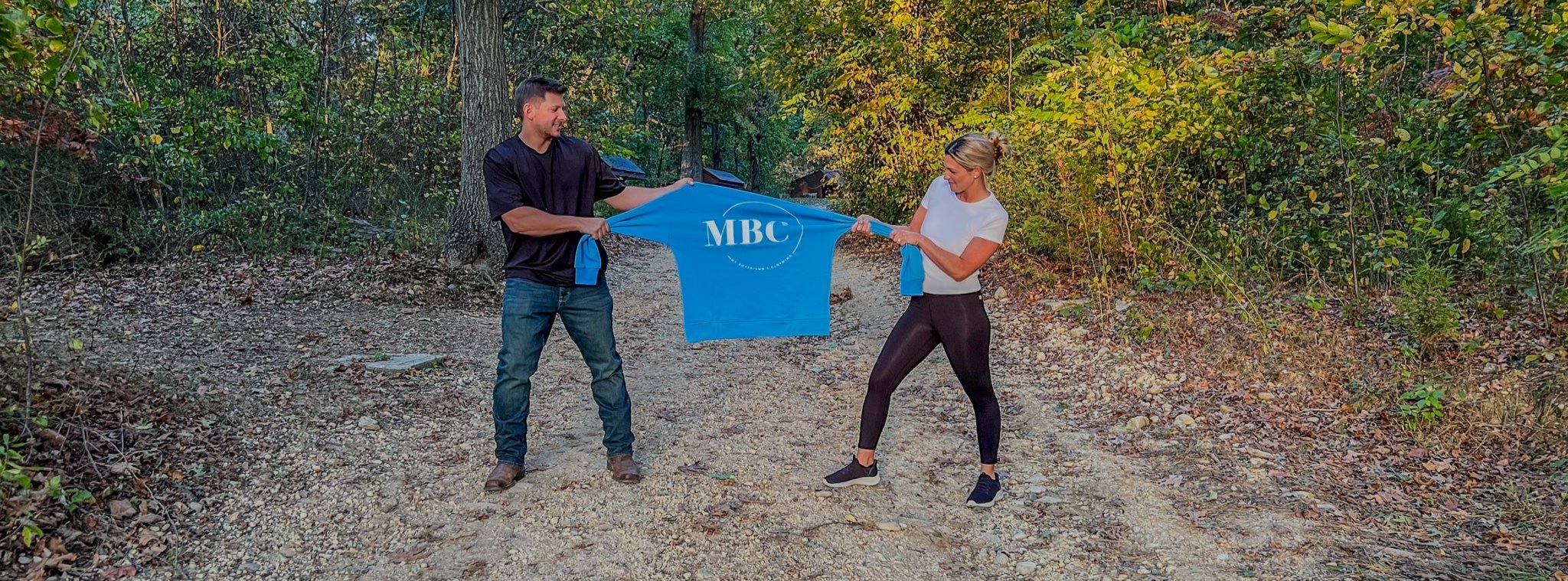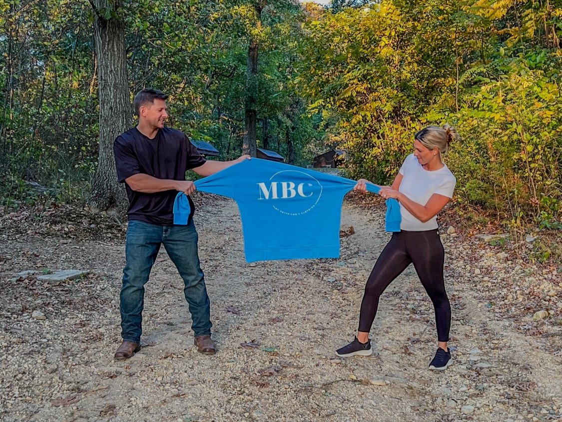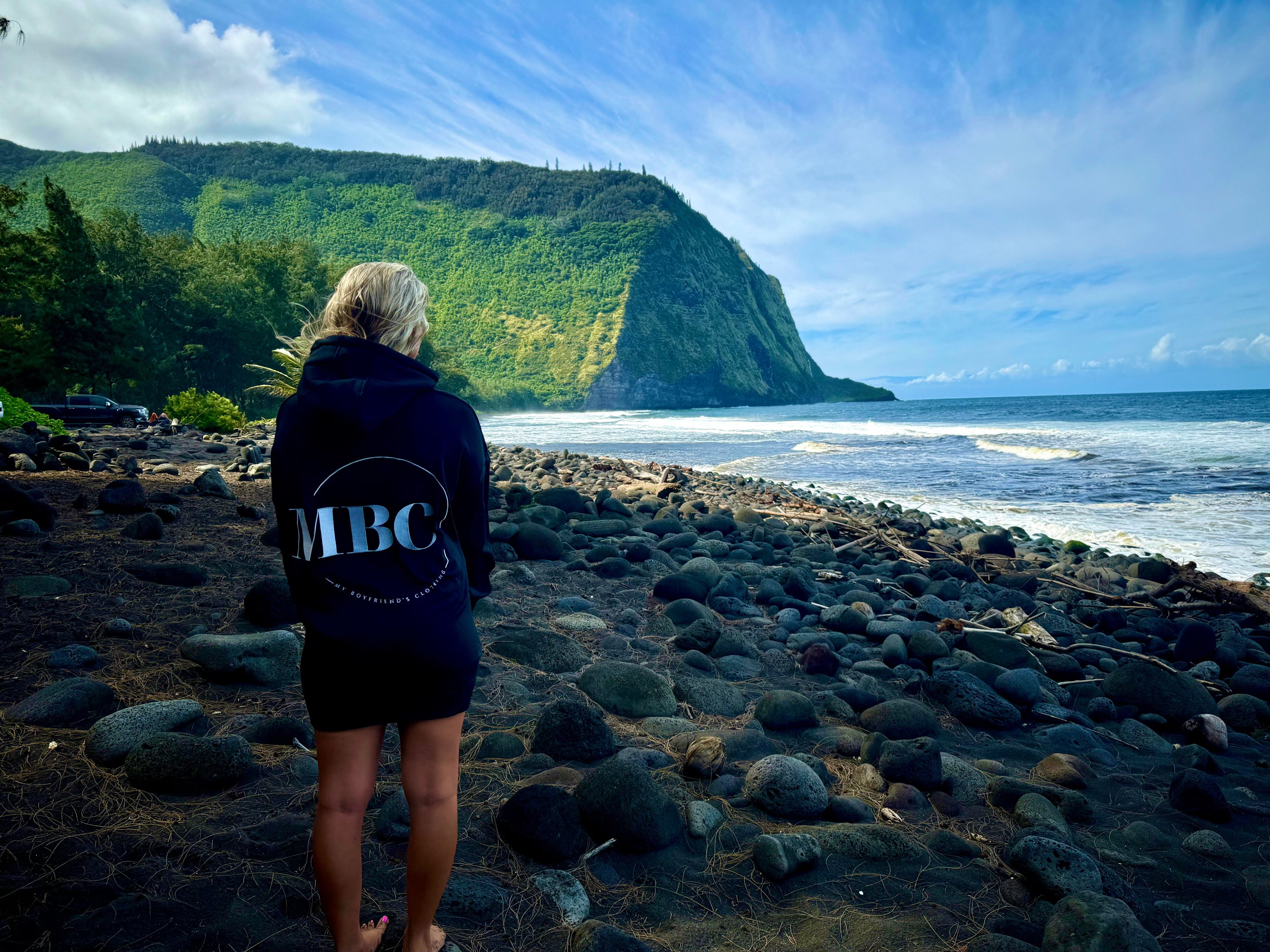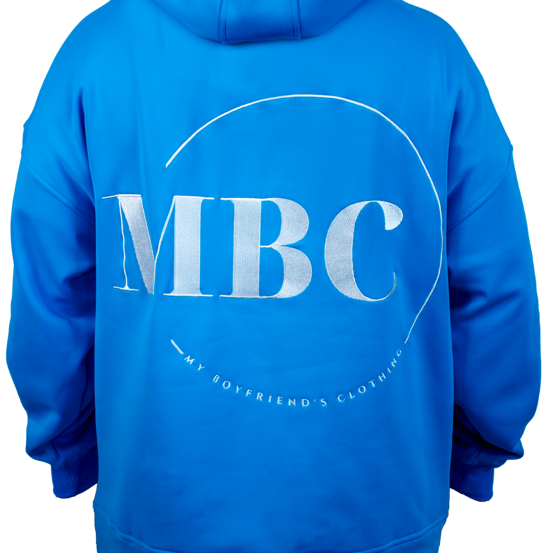 The back of the His Favorite Blue Hoodie from My Boyfriend’s Clothing, featuring an embroidered "MBC" logo in crisp white, encircled by a minimalist design with the brand name subtly arched below. The vibrant blue fabric and oversized fit bring a bold, cozy look that feels like it’s just waiting to be stolen from him.