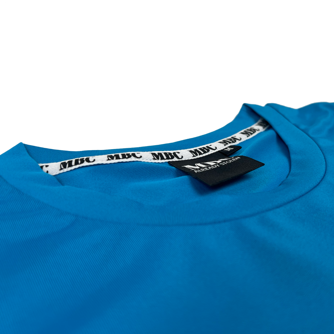 Close-up of the Ocean Pulse T-Shirt tag, highlighting the “Already Stolen” label in bold white text on a sleek black background, paired with a white neckline strip featuring the “MBC” logo in black. Every detail is designed to capture the essence of My Boyfriend’s Clothing®—our premium quality, effortless style, and a hint of playful charm in every piece.